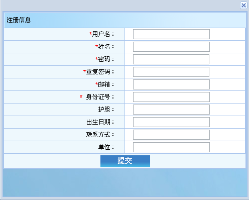对于新用户,必须点击 “注册” 按钮,进入注册界面如图1-2所示.在注册界面中,输入注册信息点击 “提交” 按钮,完成注册后才能登陆。(注:红色 星号所标注的输入项为必填项)。校外人员是否需要注册详见具体缴费通知。