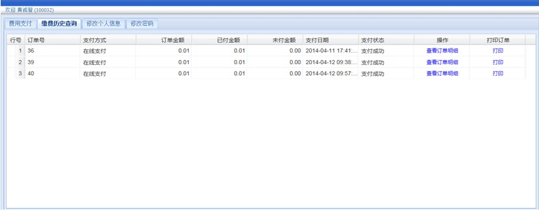 在网银缴费成功后会产生相应的订单信息如图2-7。